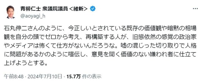 日本維新の会の青柳仁士衆院議員(45)が2024年7月10日、東京都知事選に出馬した石丸伸二氏(41)に関して、Xで見解を示した。