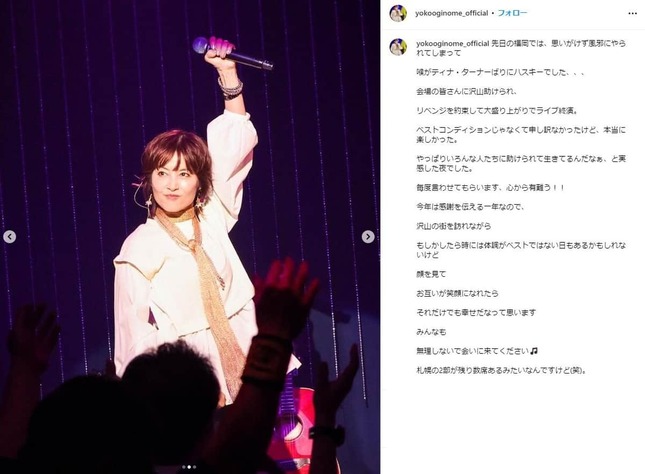 荻野目さんは12日に「Billboard Live YOKOHAMA」でライブを行うということで、10日のインスタグラムで「身体を調整しました」と報告した。