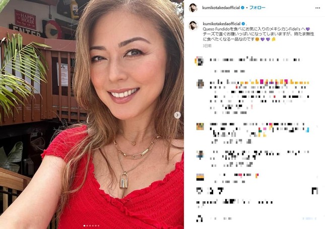 アメリカ・サンディエゴ在住の俳優・武田久美子さん(55)が2024年7月10日、自身のインスタグラム(@kumikotakedaofficial)で、メキシコ料理を楽しんだことを報告した。また、この日のファッション、真っ赤なワンピースに、フォロワーからは「赤色のワンピースとても似合ってます」「大人の色気」と反響を呼んでいる。