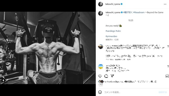俳優の竹内涼真さん(31)が2024年7月15日、インスタグラムでトレーニング姿を公開した。