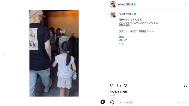 ローランドさんはハッシュタグで「#隠し子」としている。投稿された写真や動画では、子ども2人とアトラクションで横並びに座ったり、上体を抱いたりする姿や、歩きながら腰をかがめて子どもの話を聞く姿が写っている。