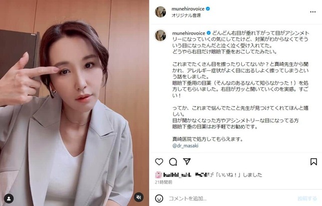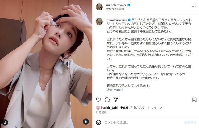 投稿でも「どんどん右目が垂れ下がって目がアシンメトリーになっていくの気にしてたけど、対策がわからなくてそういう目になったんだと泣く泣く受け入れてた。どうやら右目だけ眼瞼下垂をおこしてたみたい」と報告。