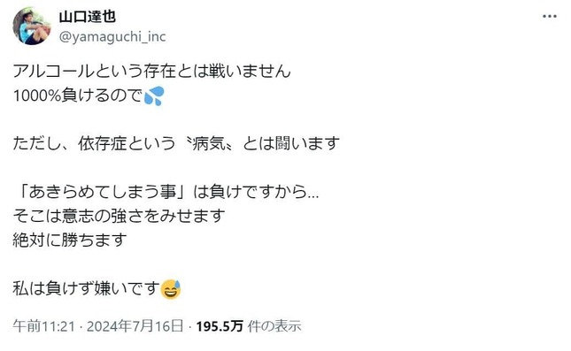 続く投稿では、「アルコールという存在とは戦いません 1000%負けるので ただし、依存症という"病気"とは闘います」との決意を表明し、「『あきらめてしまう事』は負けですから...そこは意志の強さをみせます 絶対に勝ちます 私は負けず嫌いです」との考えを語った。