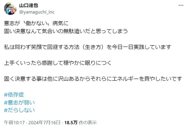 山口さんは16日、「意志が"働かない"病気に固い決意なんて気合いの無駄遣いだと思ってしまう」とXでコメント。「私は闘わず笑顔で回避する方法(生き方)を今日一日実践しています 上手くいったら感謝して穏やかに眠りにつく 固く決意する事は他に沢山あるからそれらにエネルギーを費やしたいです」と明かした。