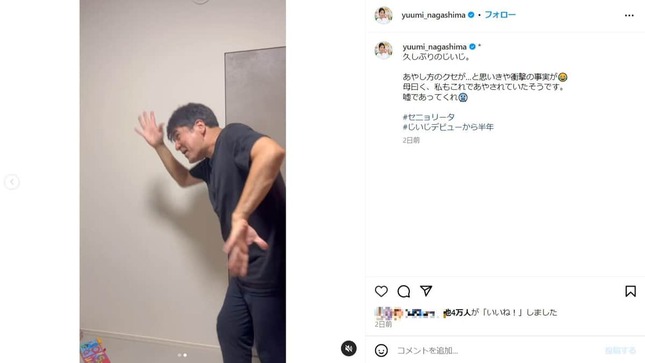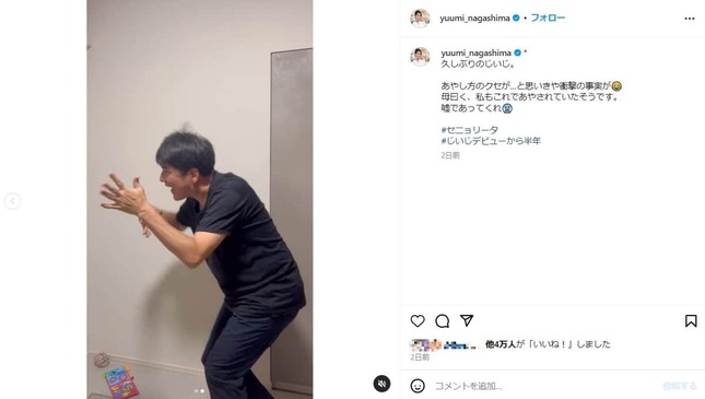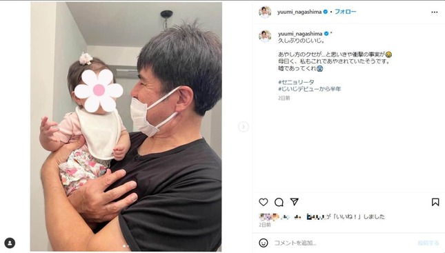 永島アナは「あやし方のクセが...と思いきや衝撃の事実が 母曰く、私もこれであやされていたそうです。嘘であってくれ」と驚きの様子。「#セニョリータ #じいじデビューから半年」とハッシュタグもつけた。