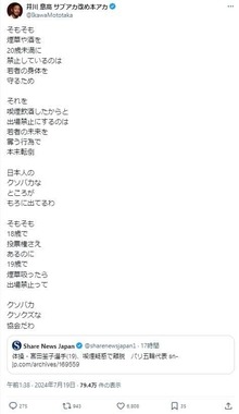 さらに、井川氏は今回の離脱に関して、「日本人の クソバカな ところが もろに出てるわ」と持論。「そもそも 18歳で 投票権さえ あるのに 19歳で 煙草吸ったら 出場禁止って」「クソバカ クソクズ」などと協会批判を展開した。