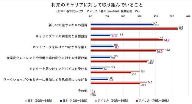まず、キャリアに対する取り組みを日米比較するために、「将来のキャリアに対して取り組んでいること」を聞くと、全体的に日米で差が大きい結果となった。
