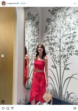 マギーさんはカラフルなタイルに花や植物が飾られた背景に、全身真っ赤に統一したコーディネートで立つ写真を披露。ミラノ発の高級レザーブランド「セラピアン」の日本の旗艦店「ヴィラ・セラピアン・ギンザ」のオープニングパーティを訪れたと報告し、「とっても素敵な様々なレザーのテクスチャーとカラーは他にないです」と感想を述べた。