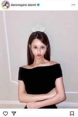 公開した写真は、肩を出したオフショルダーの黒いドレスで、美しいデコルテも見える。頭のティアラはスタンプで加工されているものだ。