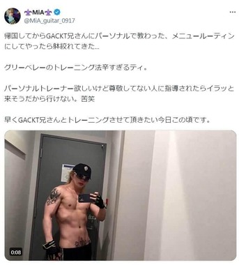 ギタリストのMiA GACKTとトレーニングで「良い感じに育って」 鍛え上げた筋肉「ビフォーアフター」公開