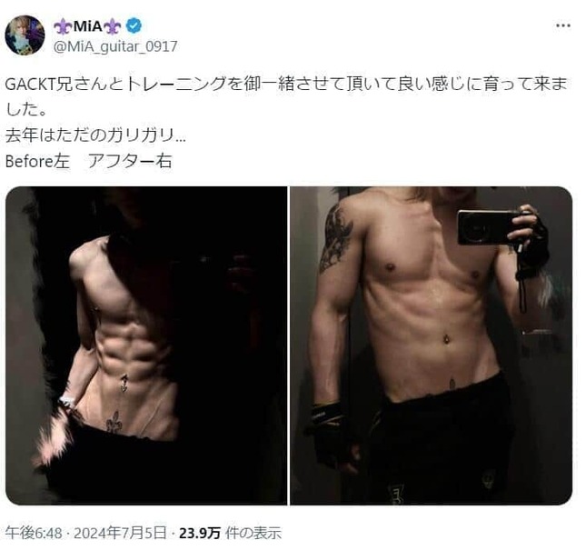 ヴィジュアル系ロックバンド「MEJIBRAY」(メジブレイ)での活動を経て、現在はサポートギタリストとしても活躍するギタリストのMiAさんが2024年7月5日、「GACKT兄さんとトレーニングを御一緒させて頂いて良い感じに育って来ました」と、鍛え上げた筋肉の「ビフォーアフター」を自身のXで披露した。