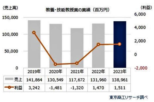 東京商工リサーチが2024年7月18に発表した「2023年『教養・技能教授業』業績調査」によると、売り上げこそコロナ禍から徐々に復活しつつあるが、肝心の利益が半減し、厳しい状況に追い込まれているという。