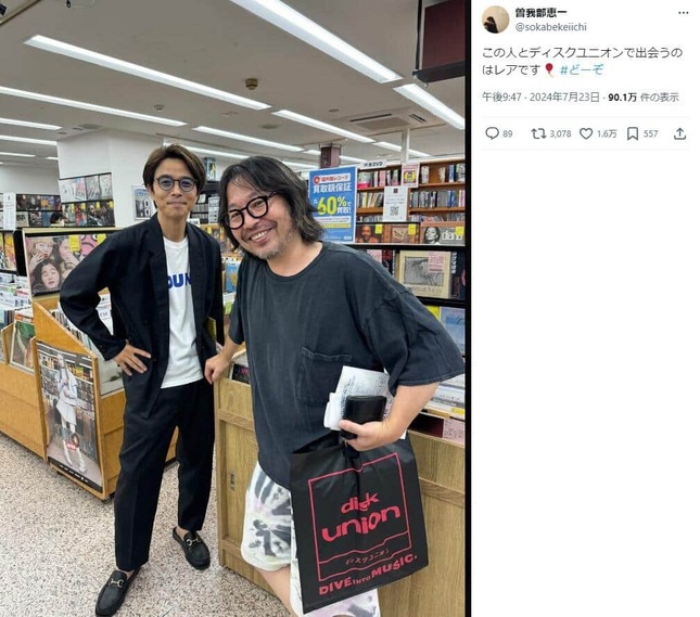 曽我部さんはXで「この人とディスクユニオンで出会うのはレアです」として、レコードショップ「ディスクユニオン」店内での井ノ原さんとの2ショットを公開。「トニセン」SNSでおなじみのハッシュタグ「#どーぞ」も添えた。