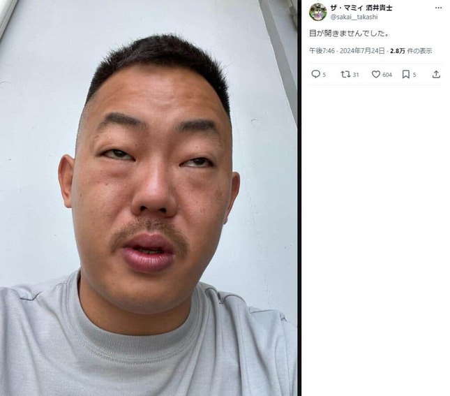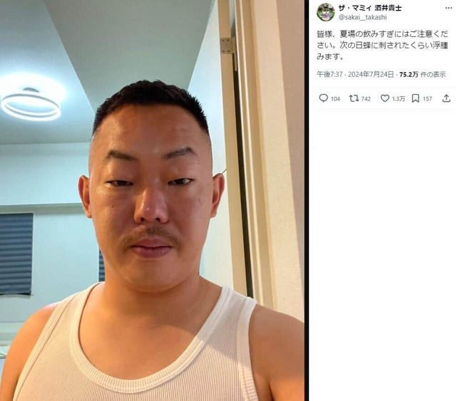 お笑いコンビ「ザ・マミィ」の酒井貴士さんが2024年7月24日にXを更新し、酒の飲みすぎで顔がむくんだという写真を公開した。Xユーザーからはツッコミが相次いでいる。