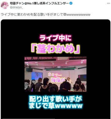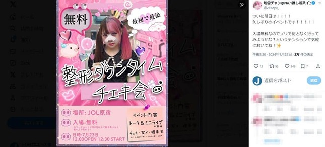 その前日の23日、地雷チャンは「整形ダウンタイムチェキ会」を、東京・JOL原宿で行った。告知ポスターには、鼻にガーゼを貼り、少々腫れた顔写真が載っている。ダウンタイム姿で、ファンに茎わかめを配るなどし、大盛況だったとのことだ。