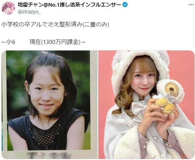 歌い手インフルエンサーの「地雷チャン」が2024年7月24日、総額1300万円を費やしたという整形後の写真と、目の二重整形のみの顔写真を並べて、Xで公開した。