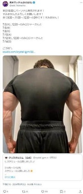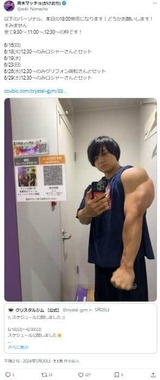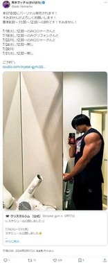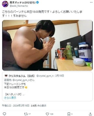 青木さんは、吉本興業所属のトリオ「かけおち」のメンバー。身長180センチメートル、体重90キログラムという筋骨隆々の体を生かし、肉体派芸人として知られるお笑いコンビ「マヂカルラブリー」の野田クリスタルさんが経営するトレーニングジムにも勤務している。