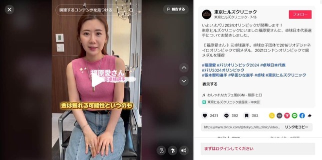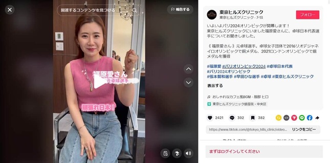 福原さんは2024年7月13日、美容整形外科・美容皮膚科「東京ヒルズクリニック」のTikTokに出演。