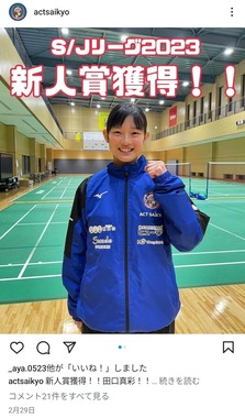 田口選手は宮崎県出身、2005年10月9日生まれの18歳。身長165センチ(㎝)。23年に世界ジュニア・女子ダブルスで優勝。4年後のロサンゼルス五輪での活躍が期待されている選手だ。現在は、山口県の女子実業団バドミントンチーム「ACT SAIKYO」に加入している。