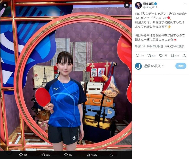 「美しすぎる卓球選手」として注目を集めている菊池日菜さんが、2024年8月4日にXを更新し、ユニフォーム姿の近影を投稿した。
