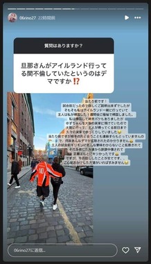 しかし今回、里乃さんはインスタのストーリーズで「旦那さんがアイルランド行ってる間不倫していたというのはデマですか!?」という質問を受けて、