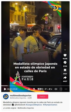 注目を集めているのは、メキシコのニュース番組「Multimedios Deportes」(マルチメディアスポーツの意)が2024年8月4日(日本時間)、「日本のオリンピックメダリストが泥酔状態でパリの街を歩く」としてインスタグラムやTikTokに投稿した動画だ。