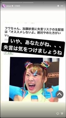 さらに加藤さんは次のストーリーズで、2021年9月12日放送の「サンデー・ジャポン」(TBS系)でフワちゃんがインスタライブの失言リスクについて語った際、「加藤紗里は絶対やめた方がいいと思う」と発言した際のネットニュースも引用し、「いや、あなたがね、、、失言は気を付けましょうね」と忠告していた。