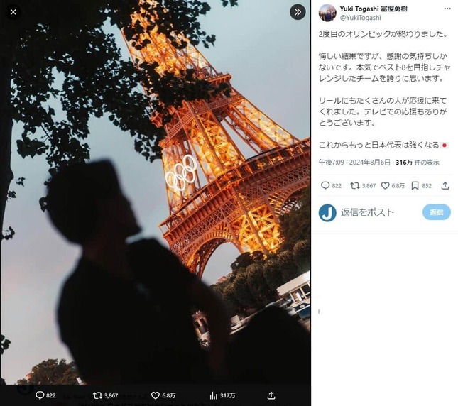 富樫選手は「2度目のオリンピックが終わりました」と切り出し、「悔しい結果ですが、感謝の気持ちしかないです。本気でベスト8を目指しチャレンジしたチームを誇りに思います」とパリ五輪を終えての気持ちをつづった。