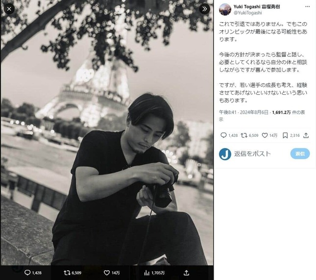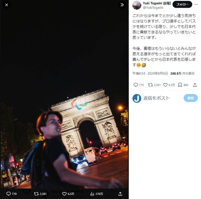 パリ五輪バスケットボール男子日本代表の富樫勇樹選手が2024年8月6日にXを更新し、パリでの写真とともに自身の今後について思いを明かした。