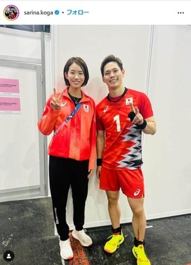 続けてゴリラの絵文字を用いて「ゴリラくんも頑張りました!!」と西田さんとの2ショットを公開。5日のバレーボール男子準々決勝、日本対イタリア戦でフルセットで敗退となった西田さんに労いの言葉をかけた。古賀さんは日本代表ジャージ、西田選手はユニフォーム姿で仲良くピースサインをしている。