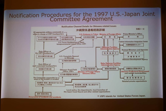 それによると、事案発生時は米軍側から防衛省側に連絡し、防衛省側から県や関係自治体に連絡することになっていた。これが現在、事実上形骸化している形になっており、県警や外務省は、今回の事案で県側に連絡しなかった理由として「被害者のプライバシー保護」を挙げている。