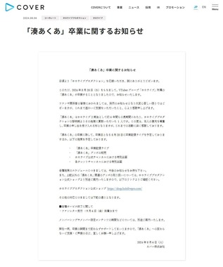 24年8月6日には、ホロライブを運営するカバー(東京都港区)も公式サイトで卒業を知らせ、「黎明期よりその発展に貢献いただいた1人です。この度は、本人の意向を尊重し、卒業の申し出を受け入れる形となりますが、これまでの活動に深く感謝しております」などと記した。