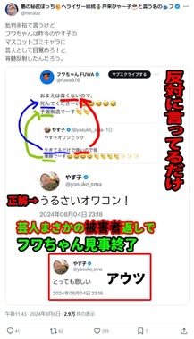 7日に公開したYouTubeでは「実はやす子のツイート見て、即、反射的に投稿しただけのように思えるんよ」と再びフワちゃんを擁護している。さらに、やす子さんが「うるさいオワコンババア」と毒づいていれば「こんな大事になっていなかったのに」と提言した。
