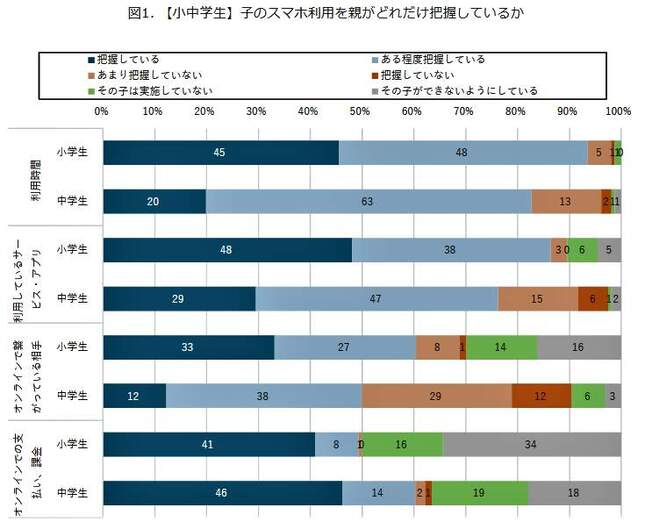 まず、親はどの程度子どものスマホの利用について把握しているのだろうか。「利用時間」「利用しているサービス・アプリ」「オンラインでつながっている相手」「オンラインでの支払い・課金」の4つの事項に聞いたのが【図表1】だ。