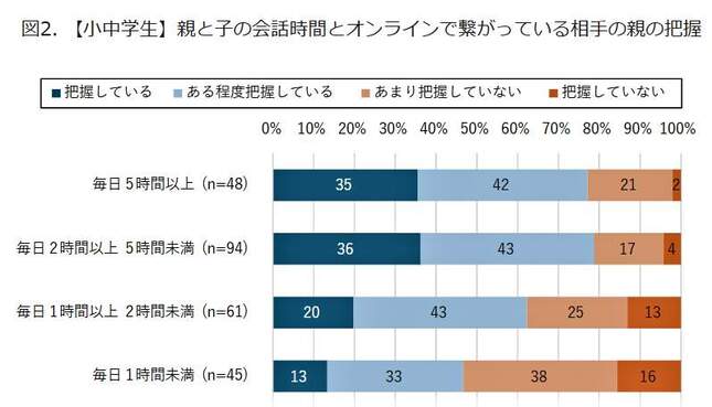 次に、親が把握している割合が特に低かった「オンラインでつながっている相手」について、普段の親子会話の時間と合わせて見た結果が【図表2】だ。会話時間が長いほど、オンラインでつながっている相手を把握している割合が高くなる。