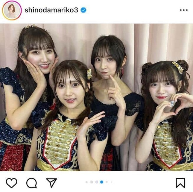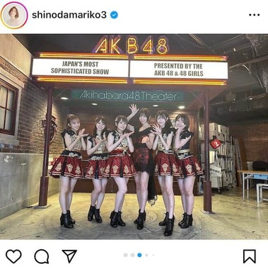 投稿された写真では、篠田さんはショートカット姿。AKB48時代を思わせる衣装を着用し、ミニスカートで美脚を披露。かつてのAKB48のメンバーと一緒に、ポーズをきめて笑顔で写っていた。