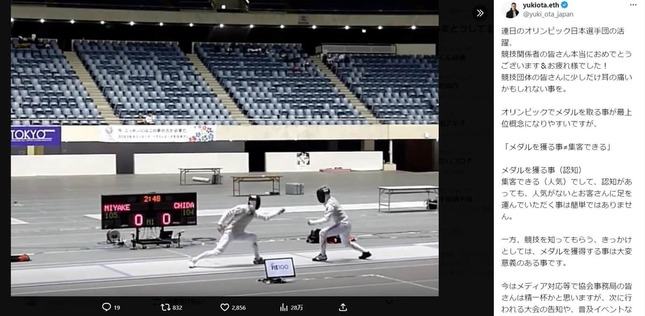 太田さんはこの投稿に、ロンドン五輪で銀メダルを獲得した後に実施されたフェンシング全日本選手権の写真を添えている。そこには、ガラガラの観客席を背景に試合をする2人の選手が写し出されていた。