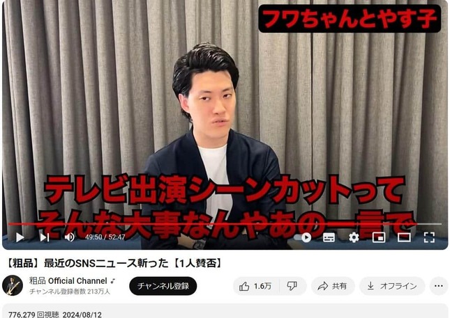 粗品さんは人気企画「1人賛否」の中で最近のニュースについて「1人で偏ったどっちかの意見っていうのは言いたくない。ですからどっちの意見も1人で言ってみます」と持論を展開。フワちゃんによる不適切投稿をめぐる騒動について語った。