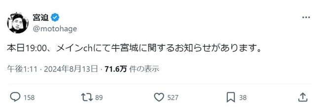 この「牛宮城」に関し、宮迫さんは24年8月13日、「本日19:00、メインchにて牛宮城に関するお知らせがあります」とXで告知した。