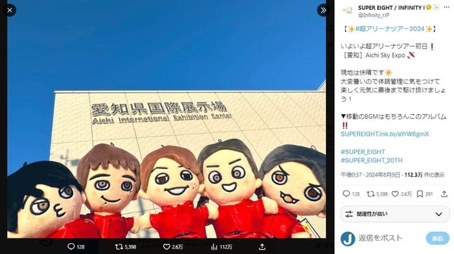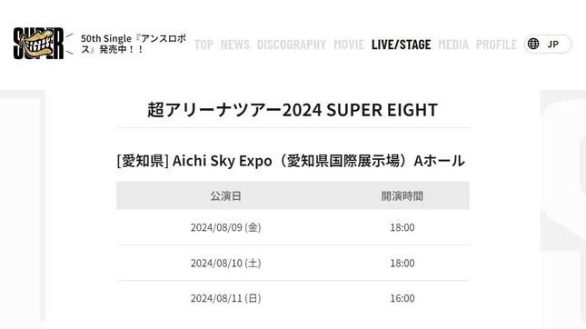 波紋を広げたのは、「超アリーナツアー2024 SUPER EIGHT」の初日にあたる2024年8月9日、愛知県常滑市にある「Aichi Sky Expo(愛知県国際展示場)」で開催されたライブだ。