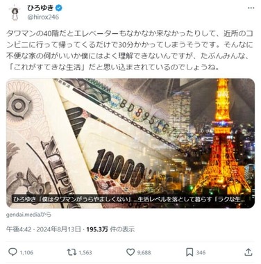 それによると、「タワマンの40階だとエレベーターもなかなか来なかったりして、近所のコンビニに行って帰ってくるだけで30分かかってしまうそうです」と移動に関して言及したうえで、「そんなに不便な家の何がいいか僕にはよく理解できないんですが、たぶんみんな、『これがすてきな生活』だと思い込まされているのでしょうね」とした。