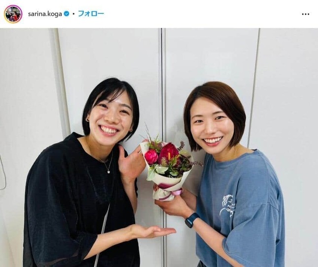 そう切り出した古賀さんは、女子バレーボールチーム「NECレッドロケッツ川崎」のチームメートだった山内美咲選手との2ショットを公開した。山内さんは現在、タイの女子バレーボールチーム「ダイヤモンド・フード・バレーボール・クラブ株式会社」へ期限付き移籍している。