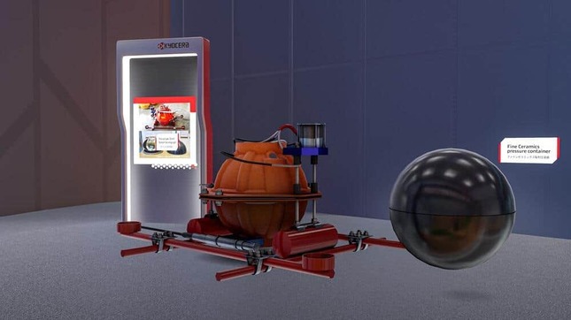「ファインセラミックスワールド」は4つのコーナーに分かれ、実際に取材したのは3つだ。VR本社ビルの中に入ると、京セラのファインセラミック製品が3Dモデル化され、数多く陳列されているコーナーに進んだ。各3Dモデルの隣には、製品についての解説が書かれたボードが設置されていた。