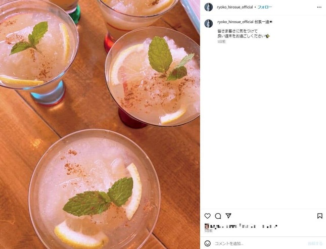 広末さんは17日、グラスに入ったシャーベットの写真とともに「台風一過」と切り出し、冒頭のように「暑さに気をつけて」などと投稿した。