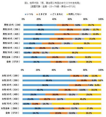 まず、「夜、寝る前に布団の中でスマートフォンを利用しているか」を聞くと、「ごくまれに」も含めて全体で約70%の人が利用している【図表1】。