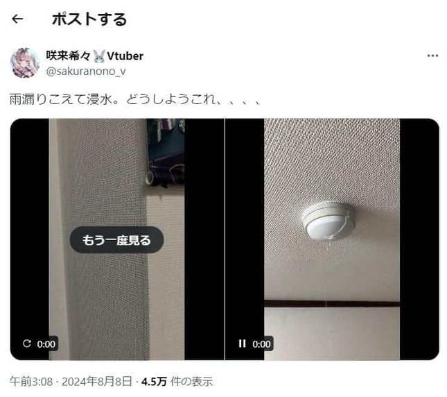 一人暮らし中のマンション上階から深刻な水漏れがあり、自宅に住めなくなるほどの被害を受けたという内容で、8月上旬にXでも報告していた。その際は天井から大量の水がボタボタと滴る様子や、水浸しになった床を業者が清掃している姿なども公開された。