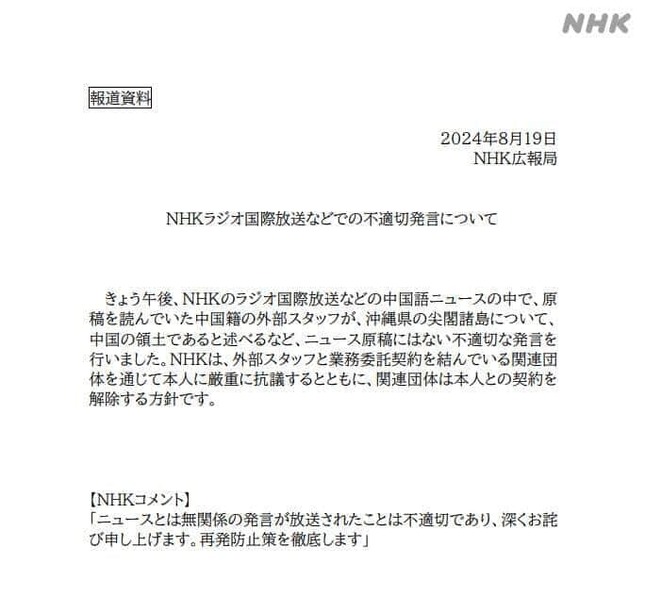 NHKのラジオ国際放送などの中国語ニュースの中で、中国籍の外部スタッフが沖縄県の尖閣諸島について「中国の領土である」などと発言した問題で、NHKは2024年8月26日に放送したミニ番組の中で「国際番組基準に抵触するなど、NHKが放送法で定められた責務を適切に果たせなかったという極めて深刻な事態であり、深くお詫び申し上げます」と謝罪した。