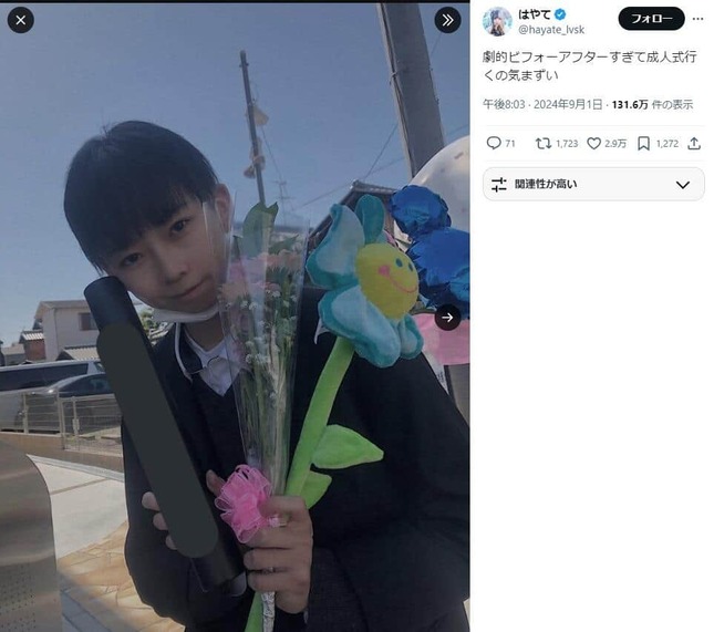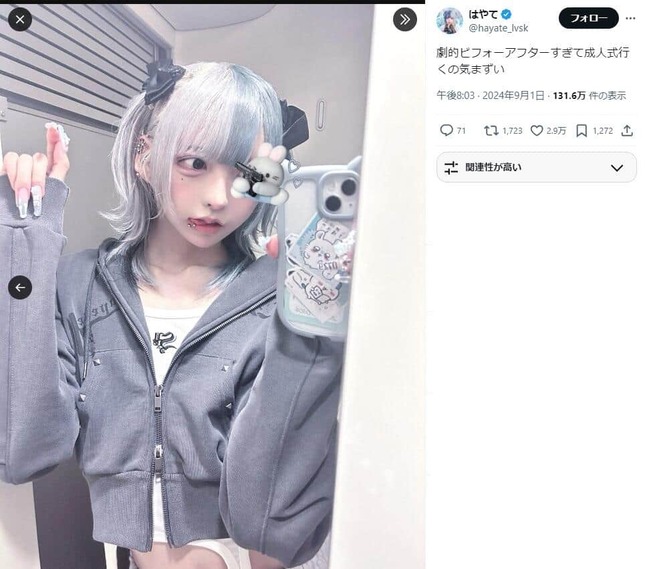 はやてさんは1日、「劇的ビフォーアフターすぎて成人式行くの気まずい」とし、学生時代の卒業式と思われる写真と近影を公開。端正な顔立ちから一変、グレーに染めたミディアムヘアに派手なメイクを施し、キラキラとしたネイルを付けた姿に変貌している。