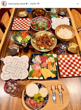 ほかの写真をみると、食卓には刺身やサラダ、カボチャの煮物などが並んでいた。また唐揚げについて、PINKYさんはストーリーズで「我が家の絶品唐揚げは勿論このレシピ」と、過去にYouTubeで公開した料理動画を紹介。手料理だったことが伺える。