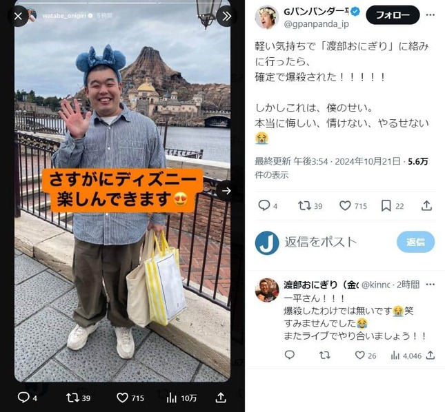 なお、渡部さんは「一平さん!!!爆殺したわけでは無いです笑 すみませんでした」とXの返信でも改めてフォローをしている。